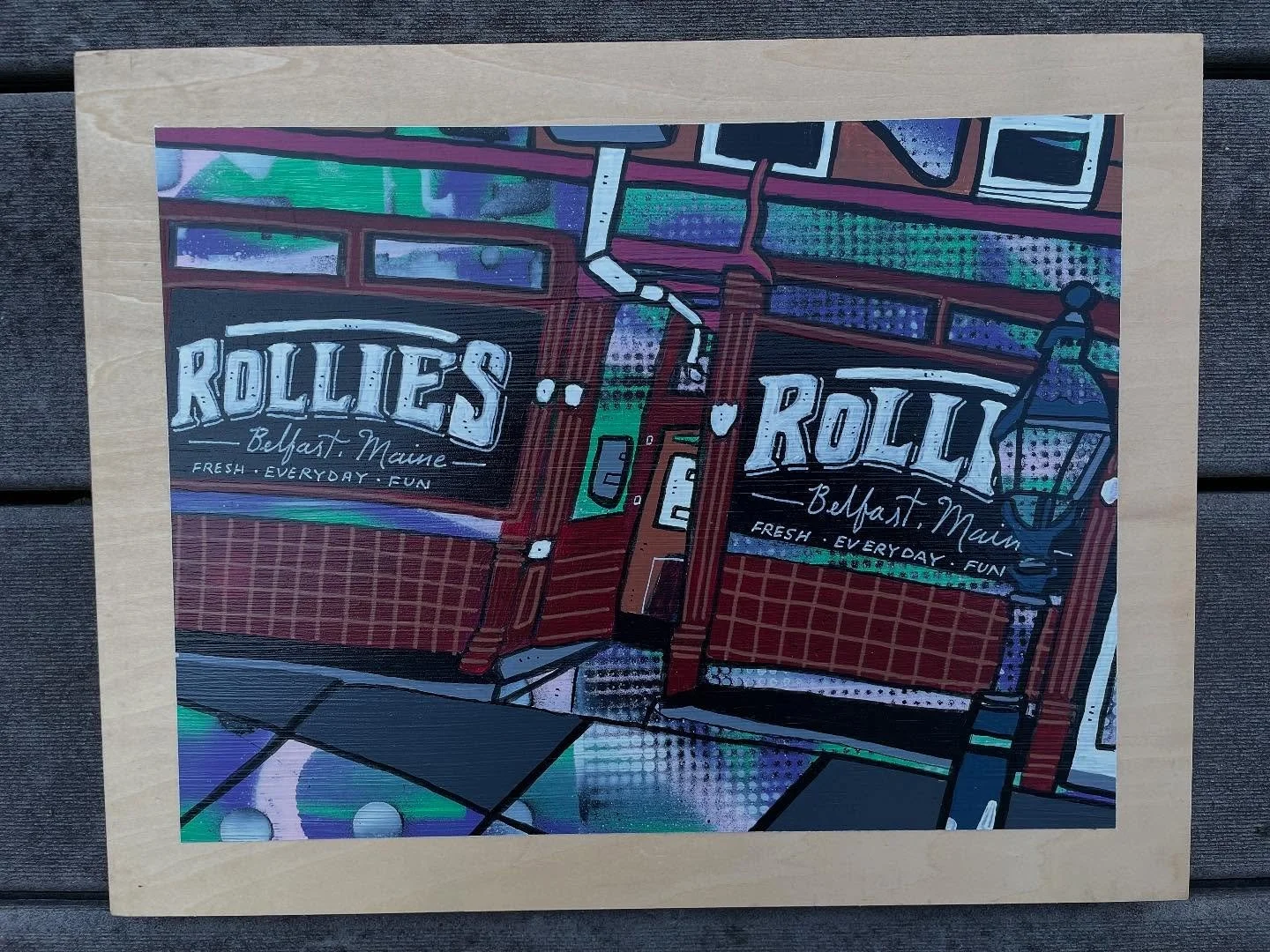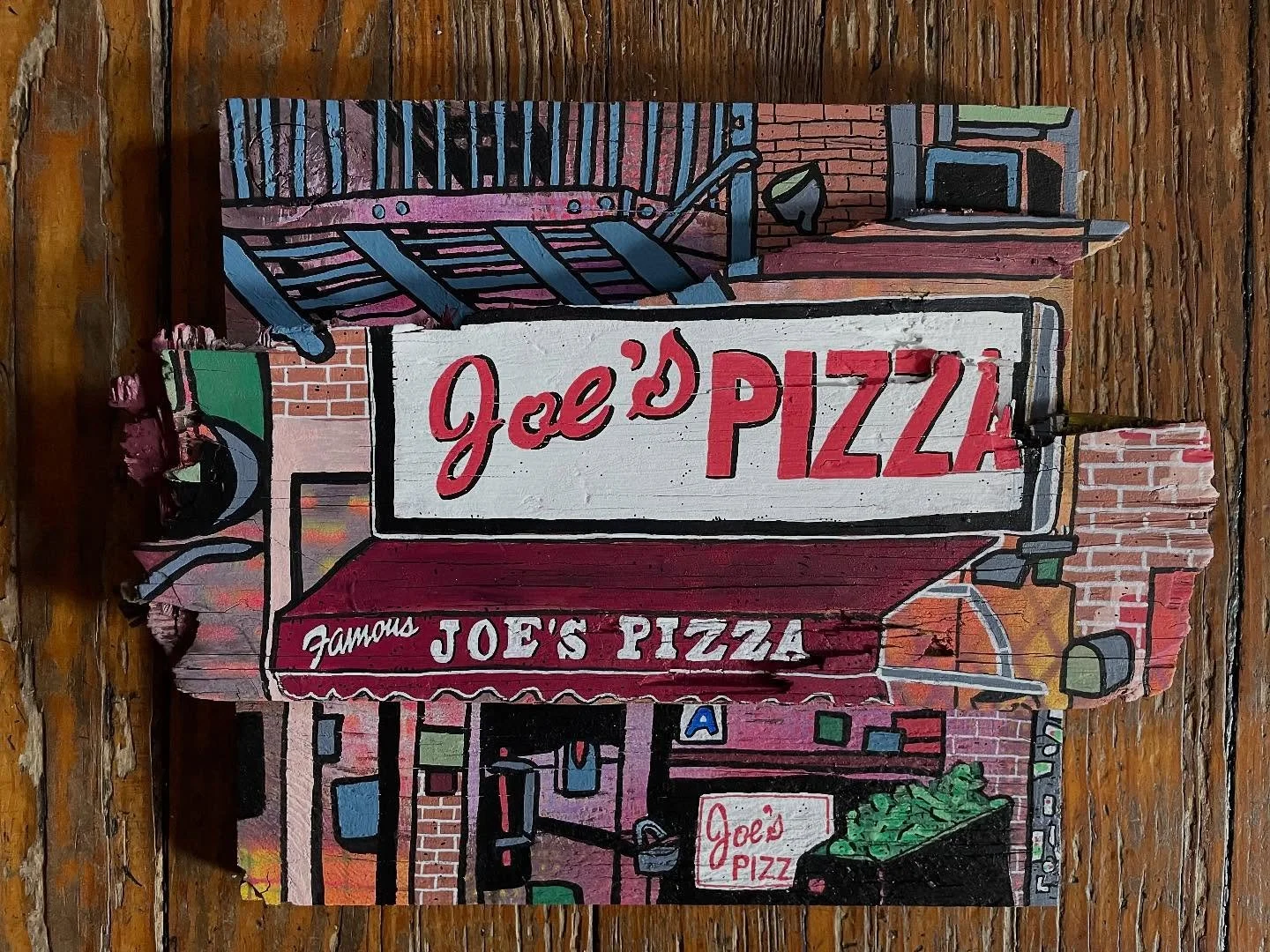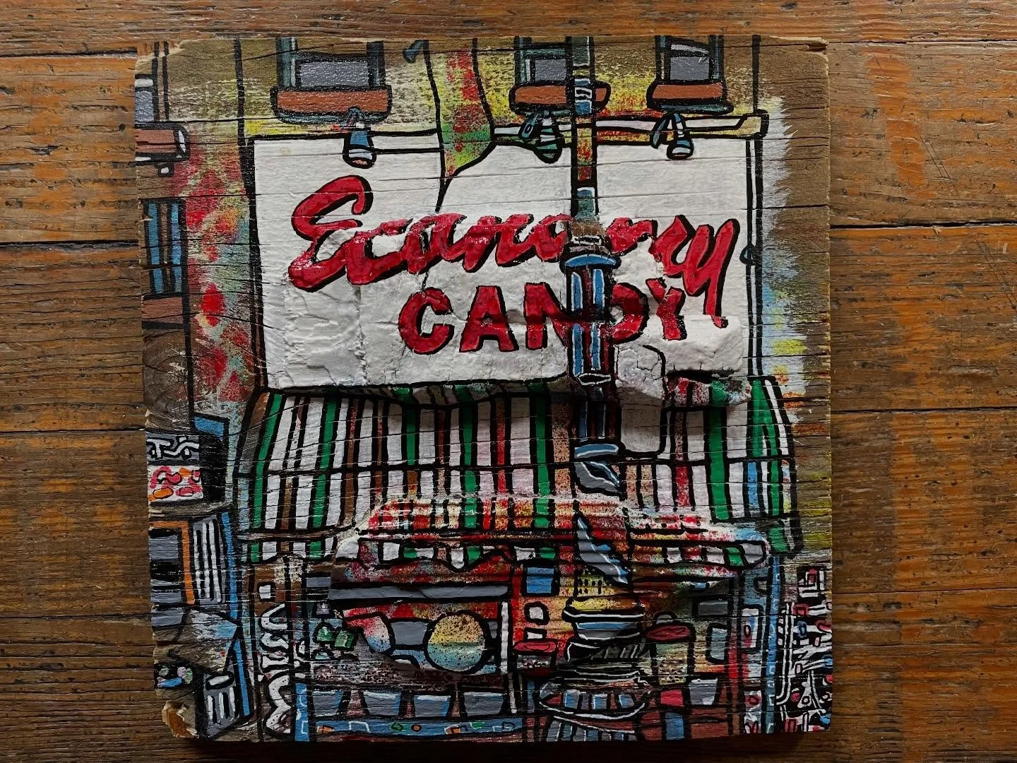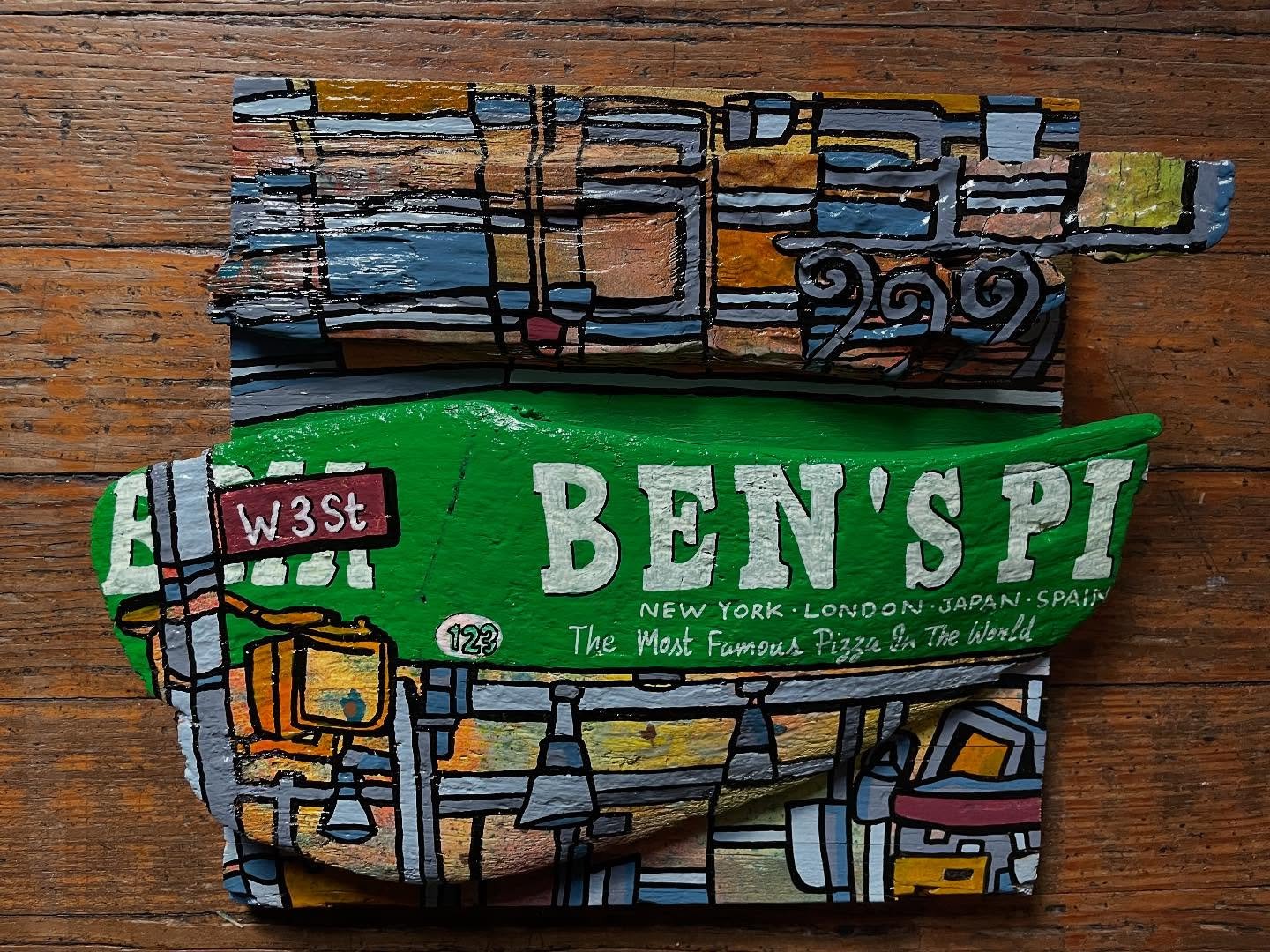 While in NYC, Sewell scouts the city streets for repurposable items for use as canvases: street signs, shipping boxes, discarded furniture. He scoops up cast-off skateboard decks, baseballs and other objects from the parks on his daily runs, bringing them to his studio for transformation. When in Maine, Sewell scavenges the seashore for washed up lobster buoys, driftwood, tree bark and other detritus. He transforms clay pots, road signs, lobster claws and haunts flea market for old wooden boxes, game boards — anything, everything can be a canvas.