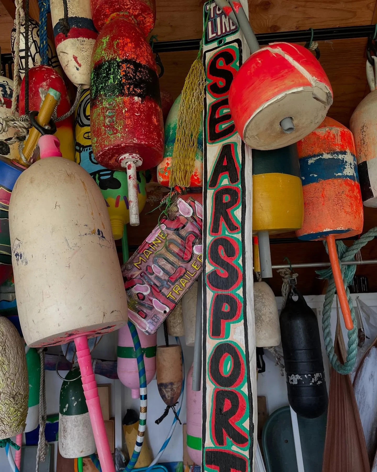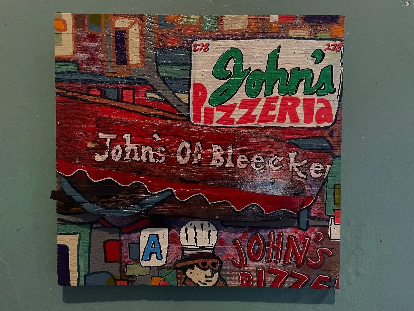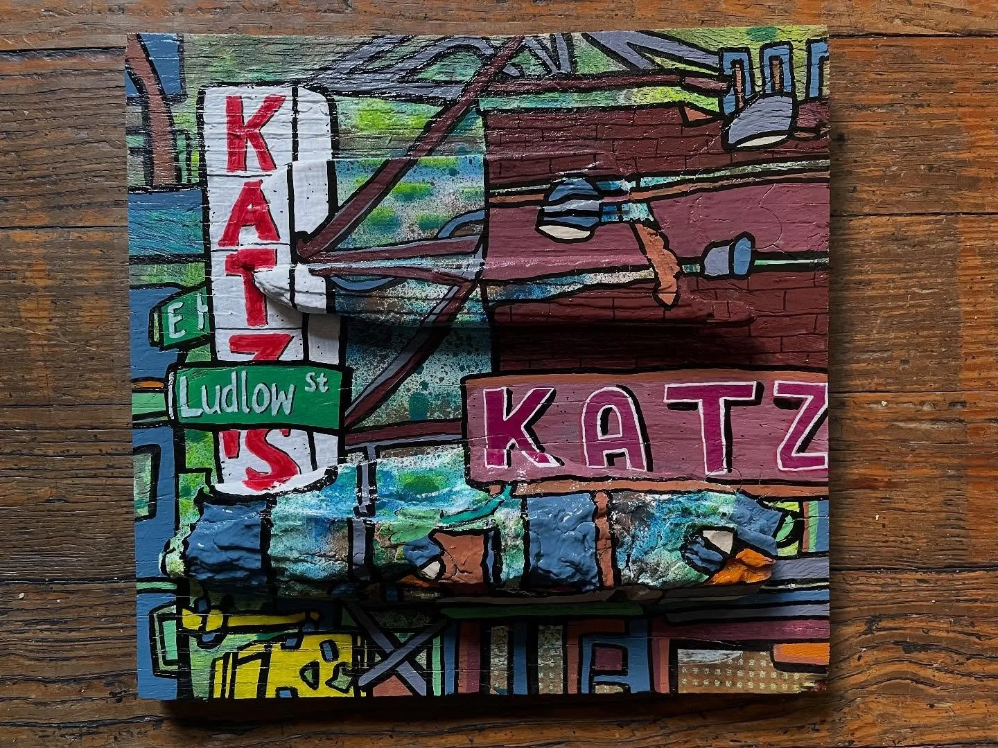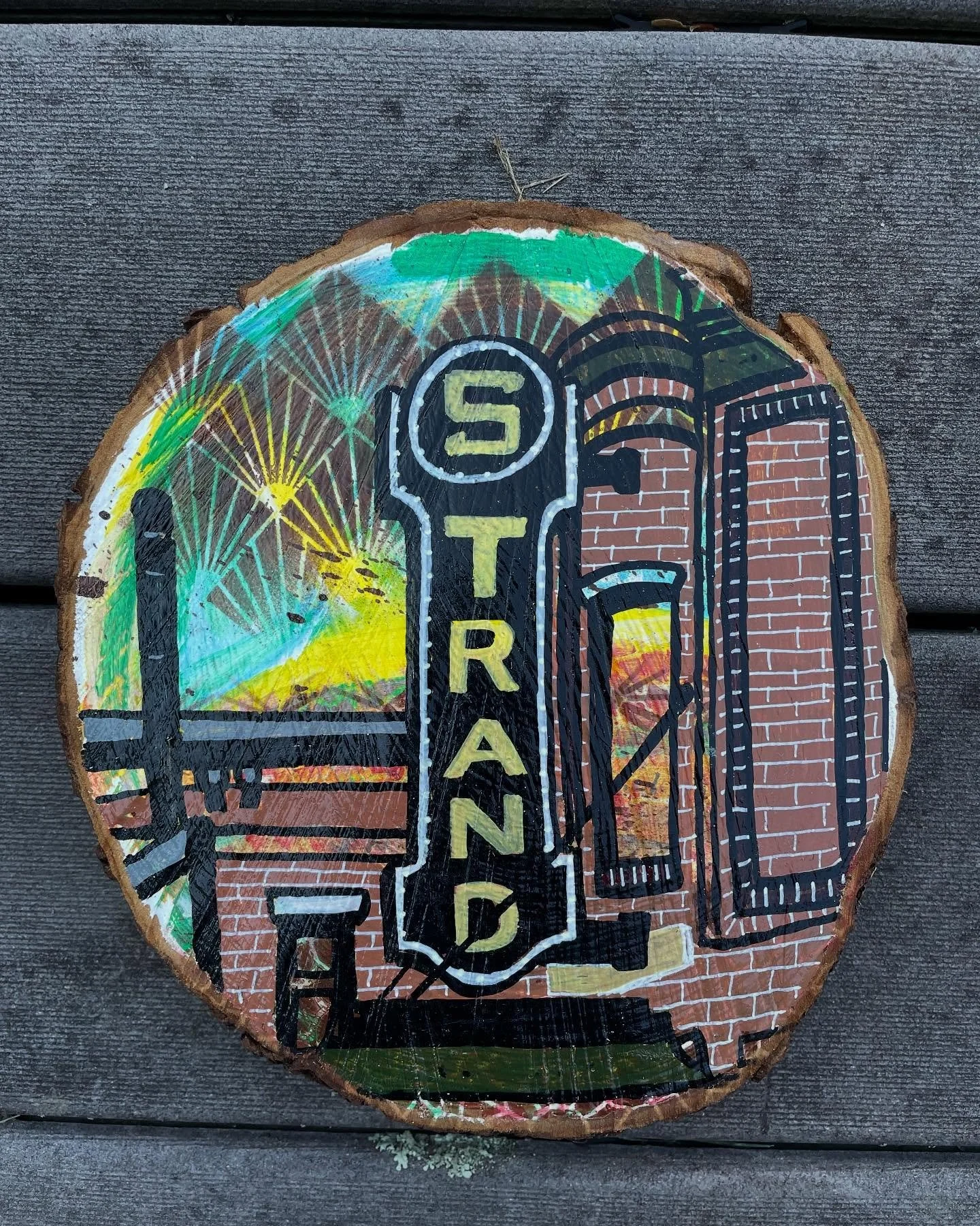 While in NYC, Sewell scouts the city streets for repurposable items for use as canvases: street signs, shipping boxes, discarded furniture. He scoops up cast-off skateboard decks, baseballs and other objects from the parks on his daily runs, bringing them to his studio for transformation. When in Maine, Sewell scavenges the seashore for washed up lobster buoys, driftwood, tree bark and other detritus. He transforms clay pots, road signs, lobster claws and haunts flea market for old wooden boxes, game boards — anything, everything can be a canvas.